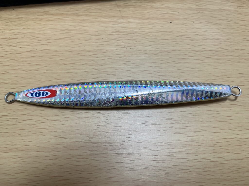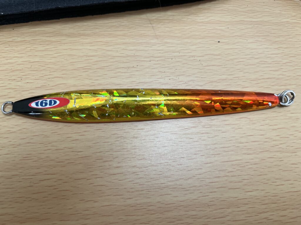 ヒラヒラと水平に近いフォール姿勢で食い渋った太刀魚にアピールします。